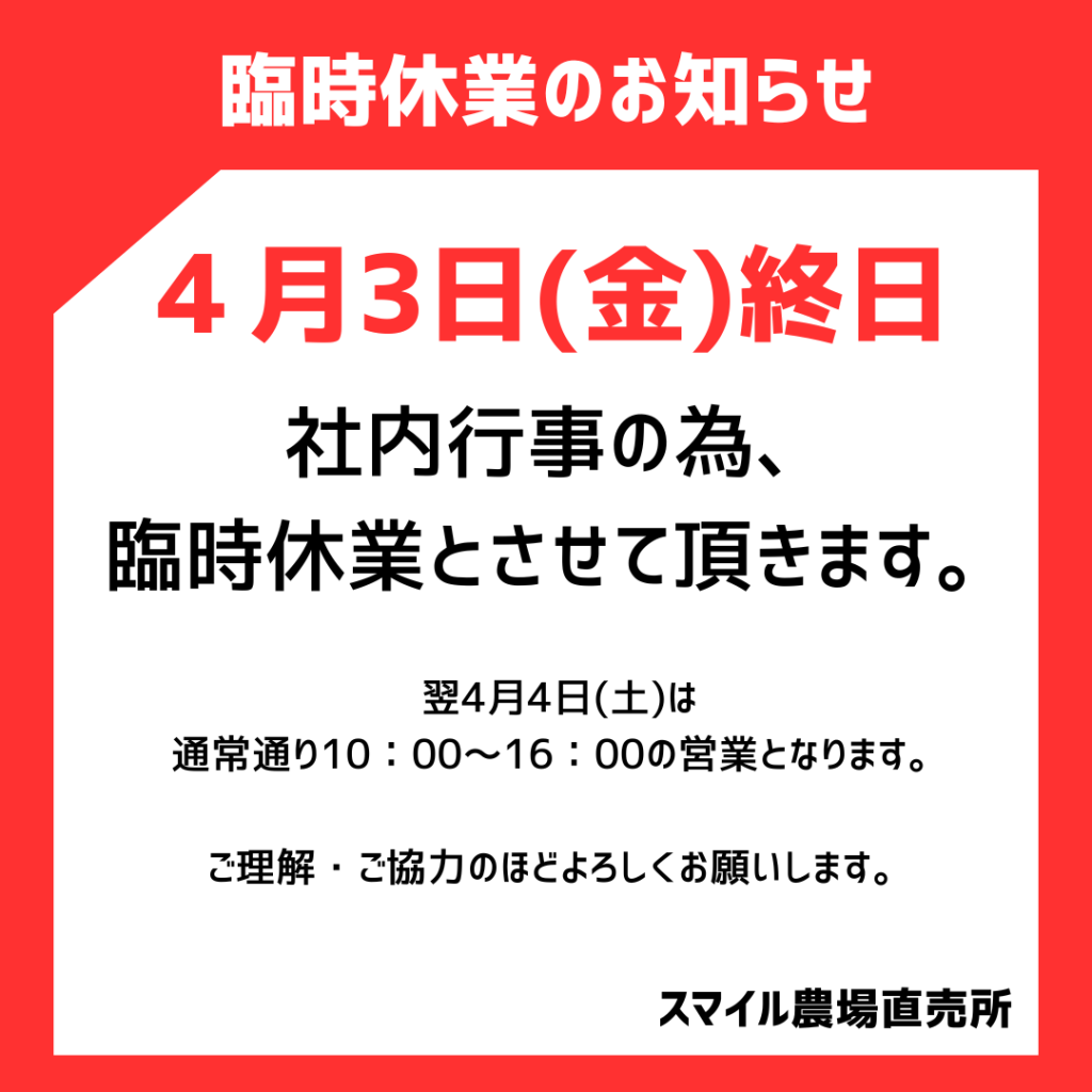 2026年4月3日(金)は社内行事の為、直売所を臨時休業とさせて頂きます。